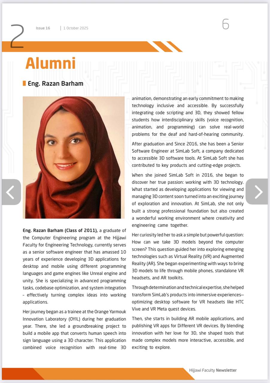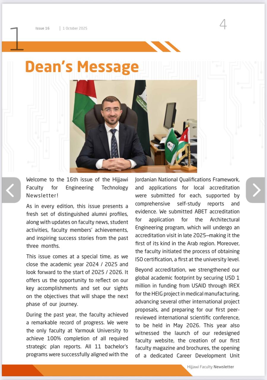 This issue coincides with the conclusion of the 2024/2025 academic year and the beginning of the 2025/2026 academic year. It features a message from the Dean, Prof. Mohammad Alzubaidi, highlighting the faculty’s key achievements over the past year. Among the most notable accomplishments are the submission of the ABET accreditation application for the Architectural Engineering program, the application for Jordanian accreditation for all undergraduate programs after successfully aligning them with the National Qualifications Framework, and the pursuit of ISO accreditation for the faculty. The Dean also reviewed several initiatives, including the launch of the Career Development Unit, the organization of the first Annual Alumni and Career Forum, and the securing of external funding for developmental projects and new academic programs.